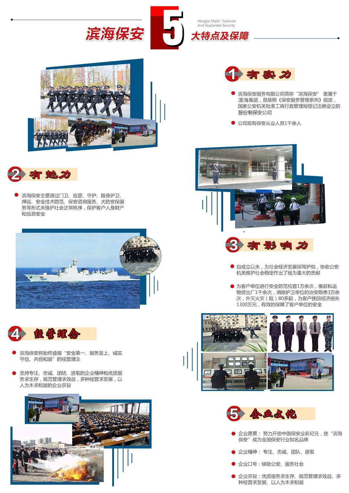 濱海保安主要通過門衛(wèi)、巡邏、守護、隨身護衛(wèi)、押運、安全技術防范、保安咨詢服務、犬防安保服務等形式來維護社會正常秩序,保護客戶人身財產和信息安全。公司現有保安從業(yè)人員1千余人,客戶單位涵蓋黨政機關、企事業(yè)單位、金融機構、高檔寫字樓、賓館飯店、高檔別墅、高等院校、大型商場、建筑行業(yè)等,現有單位100余家。